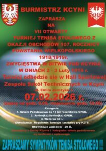 Zapraszamy 7 lutego 2026 roku na VII Otwarty Turniej Tenisa Stołowego o Puchar Burmistrza Kcyni z okazji obchodów: 107. Rocznicy wybuchu Powstania Wielkopolskiego 1918/1919 r.; 107. Rocznicy walk z formacjami niemieckiego okupanta-zaborcy na Froncie Północnym Powstania Wielkopolskiego 1918/1919 między Kcynią